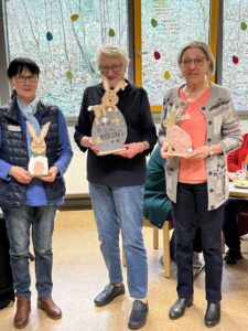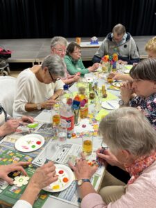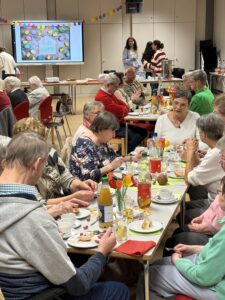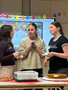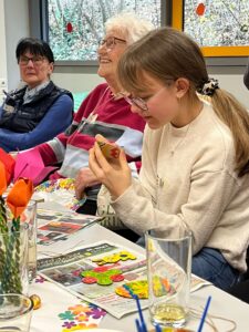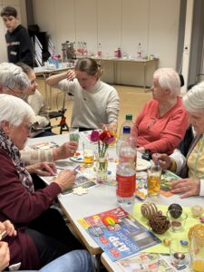 Nach einer kurzen Begrüßung durften unsere Gäste direkt selbst beim Bingospiel aktiv werden. Die Spannung stieg im Raum, wer das erste Bingo erhalten würde und damit einen der drei dekorativen Osterhasten gewinnen konnte. Nach dem aktivierenden Bingospiel durften sich alle an unserem vorbereiteten Buffet mit belegten Brötchen, Laugengebäck, Kuchen und Kaffee bedienen. Hierbei wurde neben dem wunderschönen Klavierspiel unserer Mitschülerin viel geredet und gelacht. Nachdem alle gut gestärkt waren, wurde begeistert Osterdeko in fröhlichen Farben bemalt, die jeder mit nach Hause nehmen konnte.