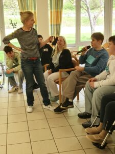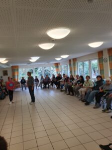 Im Rahmen des Mittagessens hat sich die Heimleiterin Simone Brand-Scheid der Klasse vorgestellt und etwas über das Seniorenzentrum erzählt. Anschließend setzten die Schüler sich mit den Senioren in einem Stuhlkreis zusammen. Nach einer ausführlichen Vorstellungsrunde und spannenden Gesprächen (z. B. über authentische Kriegs- und Fluchterfahrungen der ältesten Bewohner oder die frühere Schulzeit) spielten sie gemeinsam ein Spiel. Dafür brachten die Kinder neumodische Gegenstände mit (z. B. Smartphone und Smartwatch, Airpods, USB-Stick, Anklebe-Fingernägel). Im Gegensatz dazu zeigte die Heimleiterin der Klasse Gegenstände aus der Vergangenheit (z. B. Einkochthermometer, altes Bügeleisen, Kaffeemühle, Kernseife) oder dem Alltag der Bewohner (z. B. Dose für das Gebiss und Haftcreme). Alle rieten mit und hatten Spaß, neue Gegenstände zu erkunden, die man sich gegenseitig erklärte. Zum Abschluss machten alle ein Gruppenfoto und verabschiedeten sich. Es sind noch weitere spannende Besuche geplant, auf die sich beide Seite sehr freuen. Wir bedanken uns herzlich für die Gastfreundschaft.
