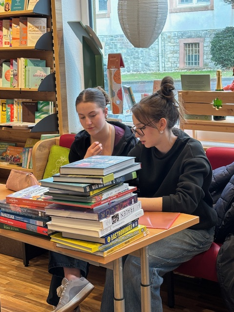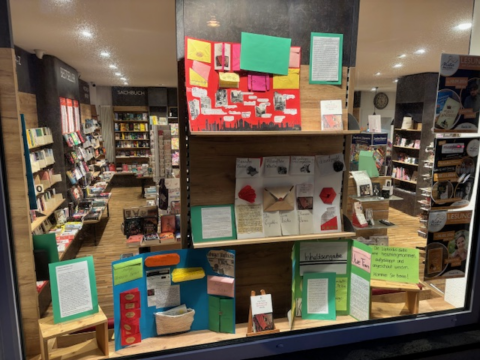 Intensiv haben sich die Schüler und Schülerinnen der Jahrgangsstufe 10 mit dem Roman „Die Entdeckung der Currywurst“ von Uwe Timm auseinandergesetzt. Die Geschichte verknüpft die persönliche Liebesgeschichte der Protagonistin Lena Brücker in Hamburg mit der Entstehung des Kult-Imbisses und thematisiert Überlebenswillen, Wahrheit, Lüge und den Alltag im zerstörten Deutschland zur Zeit des Zweiten Weltkrieges. In der produktorientierten Unterrichtsreihe entstanden beeindruckende Lapbooks, eine Verknüpfung von inhaltlichen Analysen und kreativer Gestaltung. Die Schüler und Schülerinnen sind tief in das Hamburg der Nachkriegszeit eingetaucht und haben historische Kontexte, Figurenanalysen der Hauptpersonen, Auseinandersetzungen mit der Symbolik des Romans und vieles mehr mit viel Herzblut und Kreativität in Form eines Lapbooks dargestellt. Entstanden sind beeindruckende Ergebnisse. Einige in dieser Unterrichtsreihe entstandene Produkte können in der Buchhandlung Müller in Kastellaun bewundert werden. Dort dürfen einige Schülerinnen und Schüler der Jahrgangsstufe 10 ihre Ergebnisse ausstellen und haben in diesem Rahmen auch ein Schaufenster mit ihren Lapbooks gestaltet. Für diese Möglichkeit bedanken wir uns sehr herzlich bei der Inhaberin Petra Müller-Wettstein und ihrem ganzen Team.