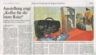 Die Ausstellung unserer Schüler auf der Marienburg “Koffer für die letzte Reise” ist nun in Kirchberg zu sehen (Rheinzeitung vom 12. Juni 2014): – Zeitung: Plakat Ausstellung Kastellaun- Kirchberg – Rheinböllen Eintragungen im Gästebuch: […]