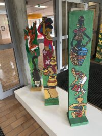 Arbeiten aus der Afrikawoche 2025 Klassenstufe 5 Projekt 7 “Holzstelen mit afrikanischen Motiven gestalten” u. 3. können sind noch käuflich zu erwerben Preis: 30,-€