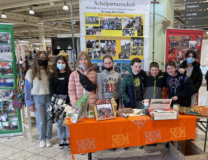 „Kunga-Ruandahilfe“ Verein und der Schulpartnerschaft der Kurfürst-Balduin-Realschule stellte auch die IGS Zell ihre Partnerschaft mit der „Groupe Scolaire Catolique Byumba“ vor. Mit Roll-Ups wurde die lebendige Schulpartnerschaft eindrucksvoll dargestellt. Seit 2012 besuchen die Schüler der IGS Zell alle zwei Jahre ihre Partnerschule. In den Jahren dazwischen konnten die ruandischen Partner in kleinen Gruppen nach Zell reisen. Die IGS Zell hat nicht nur diese lebendige Partnerschaft, sondern zusätzlich unterstützen sie zahlreiche Projekte an der Partnerschule. 2013 wurden Fenster und Dächer des Schulgebäudes saniert, 2016 finanzierte die IGS eine neue Toilettenanlage, 2018 entstand ein neuer Schulgarten, um die Schulspeisung sicher zu stellen, 2021 wurde die dringend benötigte Schulküche mit einer Zisterne gebaut. Zur Zeit läuft das Bauvorhaben, eine neue Halle zu bauen, damit die Schulspeisung reibungslos verlaufen wird, und es können Veranstaltungen durchgeführt werden. Damit dieses großartige Projekt auch in die Tat umgesetzt wird, werden alle Schüler noch vor den Sommerferien an einem Lebenslauf „Run-for-Ruanda“ teilnehmen und so ihre Partnerschaft tatkräftig unterstützen. Diese Projekte können natürlich nicht von der Schule allein bewerkstelligt werden. Nur durch die Landesmittel von Rheinland-Pfalz ist dies möglich. Diese Projekte sind auf einem weiteren Roll-up zu sehen.