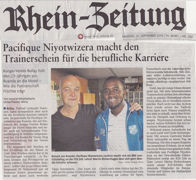 Pacifique Niyotnizera zu Gast in der IGS Zell. Der Bullayer Verein „Kunga Ruandahilfe“ hat dem jungen Lehrer aus Kirenge eine Fußballtrainer-Ausbildung in Koblenz ermöglicht. Der Verein organisierte den mehrwöchigen Aufenthalt in Zusammenarbeit mit dem Fußballverband Rheinland in Koblenz. Zum Schluss seines Aufenthaltes besuchte er die Grundschule in Ellenz und war bei uns in der IGS. Mit vielen Eindrücken, neuen Ideen für die Fußballausbildung und für Unterrichtsmethoden geht es für ihn am Freitag (20.9) wieder zurück in die Heimat.