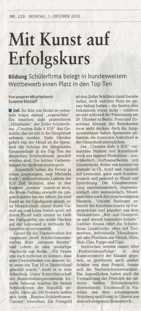 Das Weinbergsprojekt sowie die Schülerfirma haben sich mit großem Erfolg am kulturellen Leben der Stadt Zell beteiligt. Für die Schüler/innen bot die Teilnahme den Erwerb wichtiger methodischer als auch sachlich-fachlicher Kompetenzen.