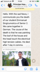 Auf tragische Weise ist unser Freund Emanuel ums Leben gekommen. Beim Anstreichen berührte er eine offene Stromleitung. Gestern hat uns diese traurige Nachricht erreicht. Emanuel war 2019 mit drei weiteren Schülern, einer Lehrerin und seinem Schulleiter zu Gast bei uns in Zell. Seit dieser Zeit verband uns eine enge Freundschaft. Viele unserer Schulgemeinschaft haben ihn in Zell kennengelernt. Wir wünschen seiner Familie viel Kraft in einer bedrückenden Zeit.